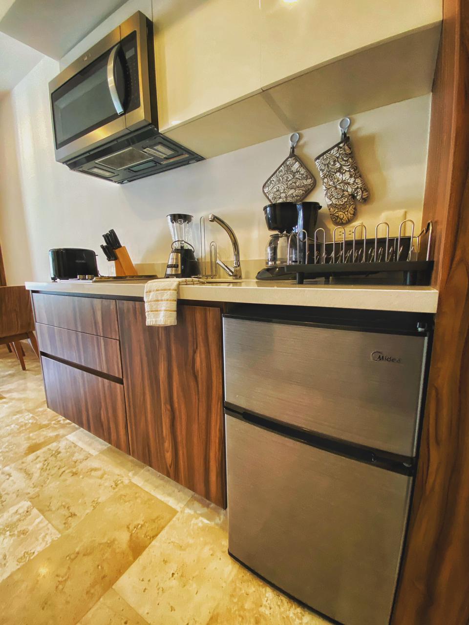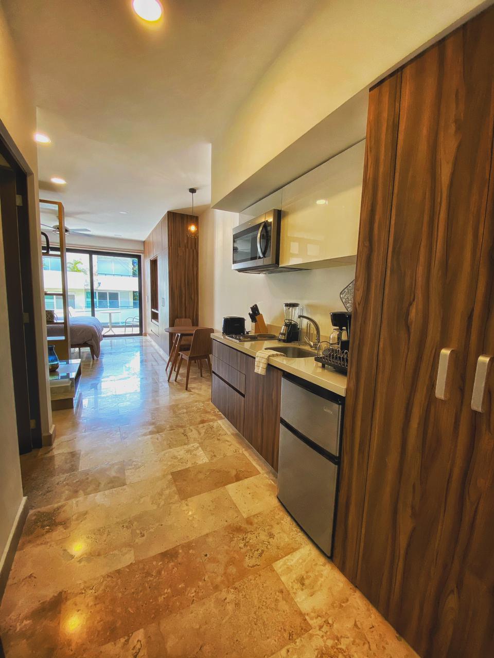 El edificio cuenta con elevador, rooftop con alberca, gimnasio , tumbonas alrededor de la alberca. La zona donde esta localizado el edificio tiene una excelente ubicación; llena de restaurantes, bares y a una cuadra de la 5ta Avenida.