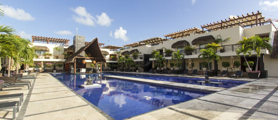 El diseño creativo de Aldea Thai Luxury Apartments se compone de piscinas infinitas y privadas, palapas, decoración de estilo asiático, espejos de agua y piscina central.