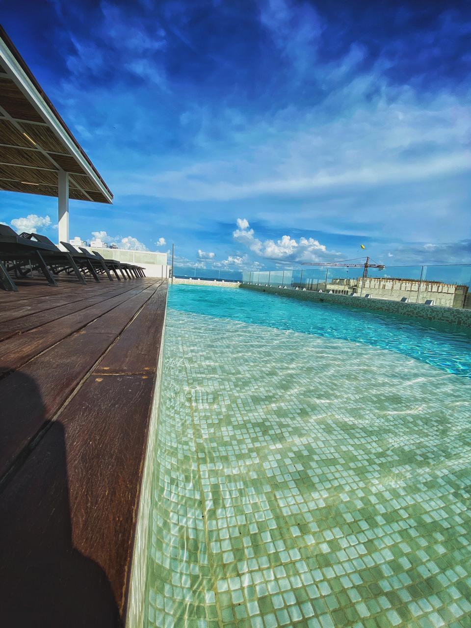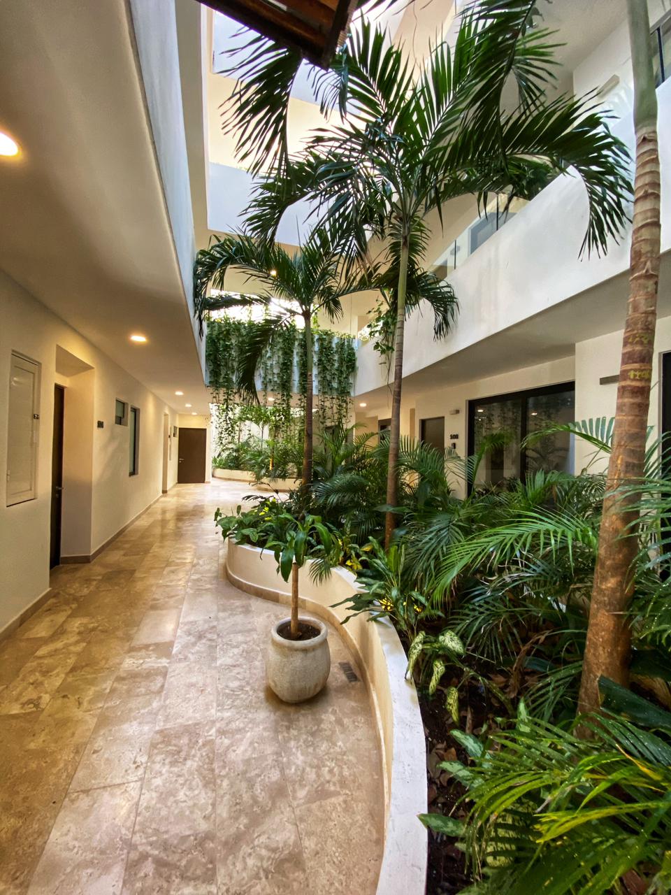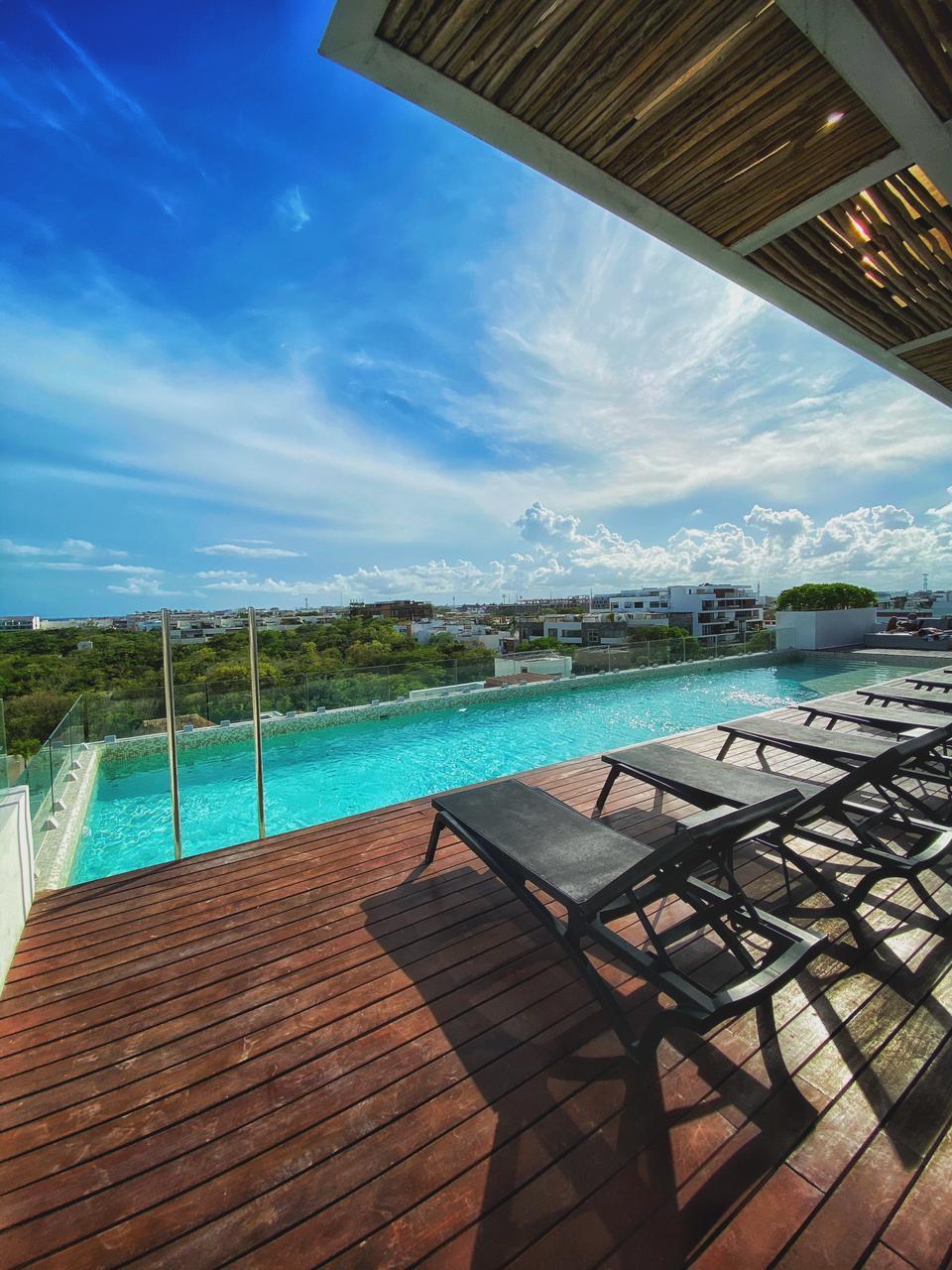 El edificio cuenta con elevador, rooftop con alberca, gimnasio , tumbonas alrededor de la alberca. La zona donde esta localizado el edificio tiene una excelente ubicación; llena de restaurantes, bares y a una cuadra de la 5ta Avenida.